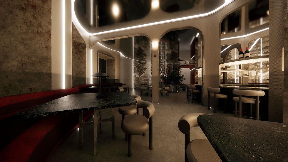 The arches dividing the octagonal floor plan create a dynamic sense of space. Instead of one open area that reveals itself at first glance, these arches invite you to explore, discovering each of the eight uniquely designed sections. They enhance the mystery and allure of the lounge, with each space offering its own distinct vibe.